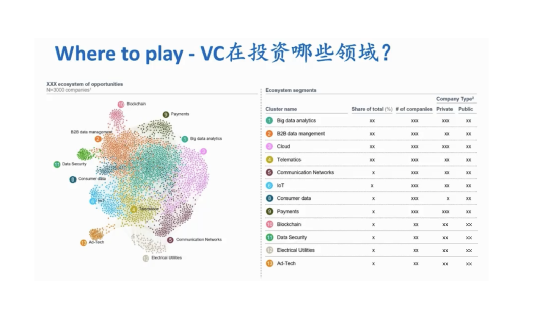 另一个角度,如果你想看邻近又是新兴的市场机会,那些蓝海市场,正在成长初期的市场,那就可以去参考VC,看他们在哪里投资,在与你相邻近的业务中,他们把钱花在了哪里,近年来在哪些领域做了投资。把这个信息列举出来,就可以知道钱流向了哪里。这也表示了市场目前最看好哪个领域,同时可以帮助你寻找到价值最大、最值得投资的领域。