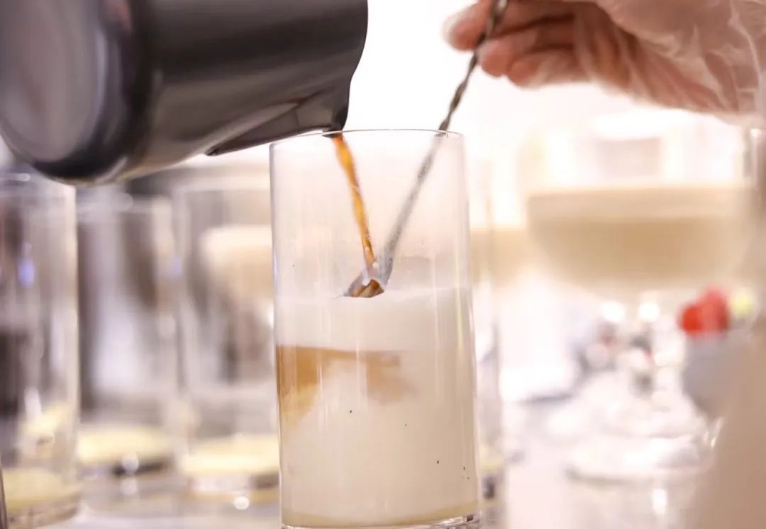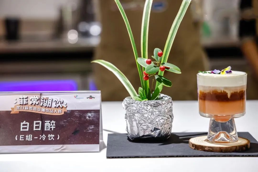 另一款冠军作品“春游日记”,则主要突出栀子花的香气,茶底应用到栀子花绿茶、栀子花蒸馏水,搭配咖啡浓缩,最后注入黑白牛奶、黑白淡奶,让口感更顺滑。