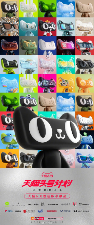 天猫发起「天猫头号计划」,以「万物即刻上头」为主题,携手 Adidas neo、Burberry、肯德基、百事可乐等 15 大品牌,同时结合 16 型人格的购物特点,限量限时发行 32 组限定数字藏品头像。此次天猫与品牌们在经典猫头的造型基础上,结合各自品牌定位和风格进行大胆创新「换装」,打造多款酷炫潮流的数字单品。