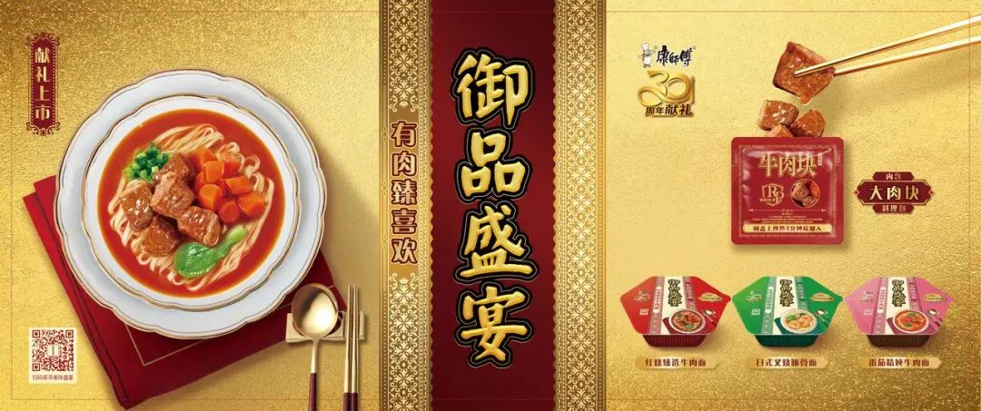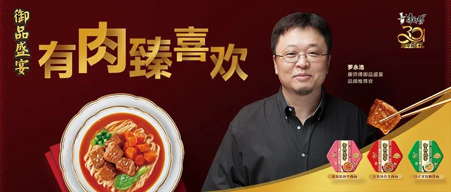 在成立的第30年,康师傅推出了首款定位超高端市场的方便面产品「御品盛宴」。该产品售价12元,以大块厚切肉为核心卖点。产品的发售节点特意选在中国最大的网络购物节双11,并找来抖音头部主播罗永浩代言,在线上进行高频次的种草。