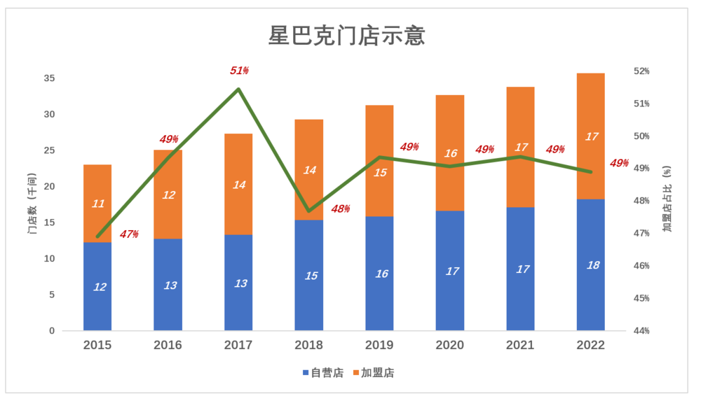 截至2022年10月2日(财年结束日),星巴克在全球拥有3.57万间门店,其中加盟店占比为49%。过往四个财年,这个比例基本没有变化。