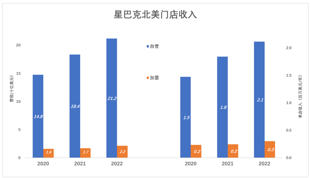 2022财年,星巴克北美自营门店总收入达212亿美元,单店年收入211万美元(以年初、年末门店数均值为分母),较2020财年提高43.6%。