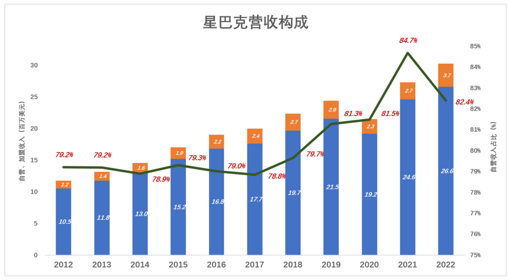 2017年之前,星巴克在全球业务中自营收入占比低于80%;2018年开始小幅上升到80%以上,与在中国采取“全自营”不无关系。