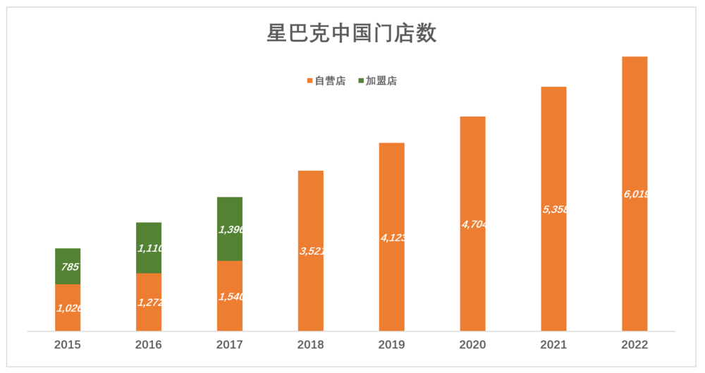 2022财年(截至于2022年10月2日),星巴克在中国拥有6012间自营店。而瑞幸于9月末的门店数7846间。