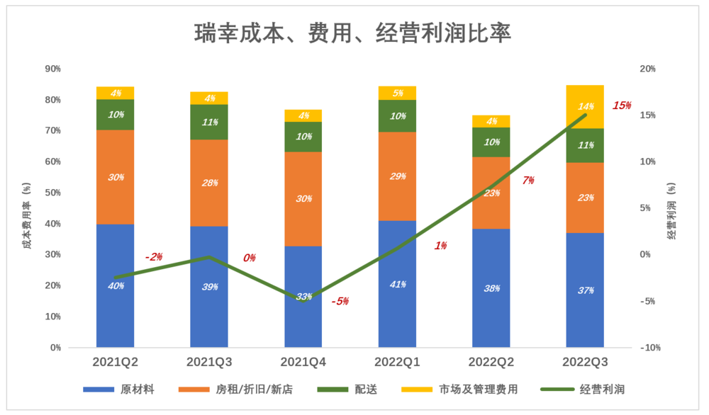 原材料成本不相上下,门店相关成本较星巴克中国将近20个百分点,加上10%的配送成本,瑞幸仍然胜券在握。2022年Q3,瑞幸经营利润率达15%。