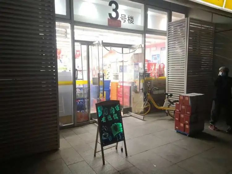便利店门口竖起了“店内有热饮”的提示牌。/新周刊记者 摄