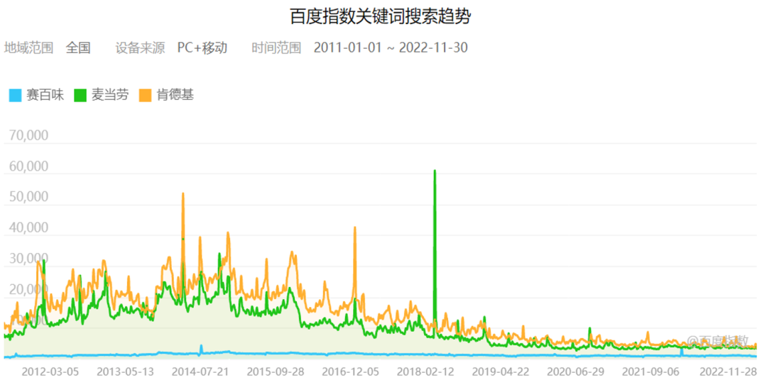 在营销上,麦肯一直在大玩特玩联名、玩具、咖啡、主题店等,把自己变得年轻、时尚。而赛百味一直守着传统的老形象,在营销上也鲜有可圈可点之处。以中国市场为例,三者的品牌声量差距巨大。