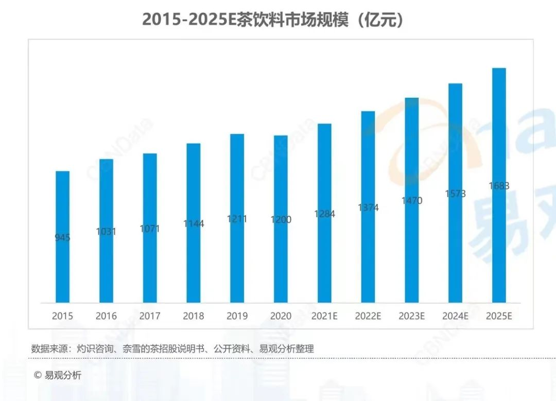 辩证看来,农夫山泉的成功确实离不开在瓶装水领域的深耕,但其在其他赛道的深度布局也为其成功奠定基础。例如旗下的东方树叶产品,AC尼尔森数据显示,东方树叶占据我国无糖茶市场50%以上的市场份额,且从2019年开始,连续多年成为品类第一品牌,销量逐年稳步增长。作为中国仅次于瓶装水的第二大市场,茶饮料拥有超过1200亿元的市场规模,但根据易观分析发表的《2022无糖茶饮料发展洞察分析》显示,近五年中国茶饮料市场增速不断放缓,年复合增速仅3%左右。历史悠久的中国茶出现在生活的各处,从整颗炒制晒干到打碎成末装袋,从茶壶茶碗茶杯流进各异奶茶杯中......而如今,常规茶饮料增速趋缓,迫切需要找到下一个增长点。