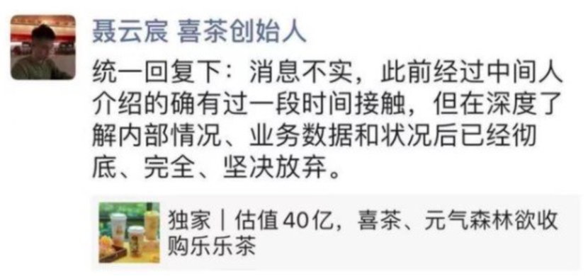 随后聂云宸在朋友圈公开否认收购乐乐茶:“消息不实,此前经过中间人介绍的确有过一段时间接触,但在深度了解内部情况、业务数据和状况后已经彻底、完全、坚决放弃。”