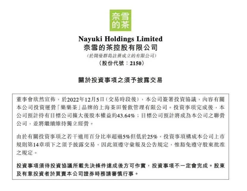 12月5日,奈雪发布公告称,已完成对乐乐茶(上海茶田餐饮管理有限公司)的投资协议,以5.25亿元收购乐乐茶43.64%股权。