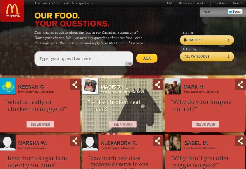 他们为此开设的这个our food, your questions问答社区,让用户有地方吐露心声,询问他们想了解的和麦当劳相关的任何问题,看他们的问题分类,消费者可以询问和麦当劳使用的牛肉、鸡蛋、鸡、配料等任何相关问题。