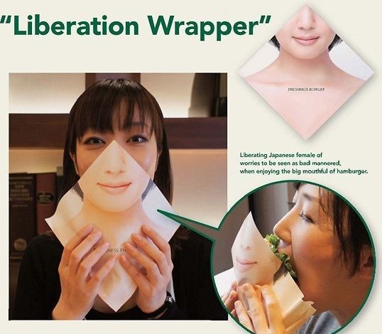 在公开的照片中,一名女性正在露着微笑看着镜头。如果您仔细观察就会发现,其实那是汉堡的包装纸。这家汉堡为照顾女性顾客的姿态,特别推出微笑汉堡包装纸,减少了女生在吃饭时的尴尬。据悉,自从这家汉堡店推出包装之后,销售额增近200%,成为人气商品。