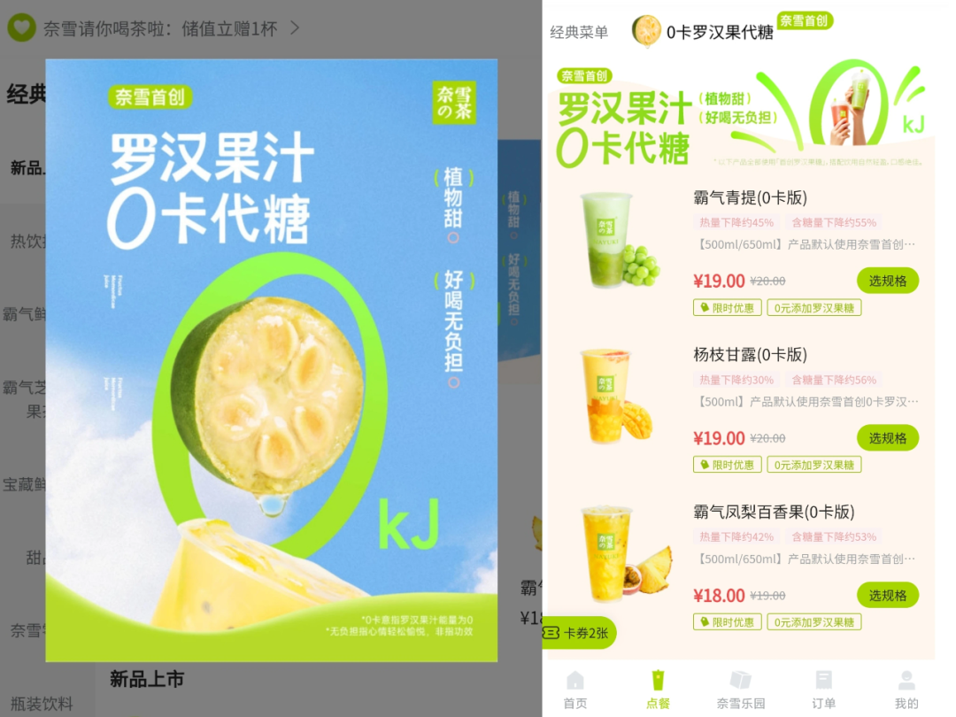 持续进行不同原料、呈现方式的挖掘,以提供更多元的风味和颜值变化,是市场需求下,糖浆和小料在进行的变化。这个观点要表达的,不是对小料市场增量的否定,而是对新方向的理性思考——在多元创新以外,更值得关注在标准化上的探索。在茶饮新品快速创新迭代的过程中,小料是表现一杯饮品丰富度的重要角色,这个角色的高峰在2018年前后。但随着新茶饮产品主形态形成、大的品类特征趋于稳定时,小料的个性化表达功能在减弱。同时从市场端看,茶饮“万店时代”开启,品牌连锁性增强,对小料的要求就体现为标准化,要求减少在门店的操作流程、确保食品安全、避免不必要的浪费。原来很多小料都是门店加工的,随着对人工和坪效的要求提升,会要求更多步骤在工厂制作。在连锁门店,小料的主要价值就会变成“不影响口感”,产品差异和个性化主要通过供应链支撑下的主料完成。近两年供应链端推出的新类型小料,也在验证市场对标准化追求的趋势:“免煮珍珠”的应用,晶球包装类、谷物罐头类即开即用小料增多,奶盖推出预打发类型,喷射奶油不断优化等,都是减少门店操作,向标准化方向做演化的形式。品牌、研发端都在认为:健康将是未来几年做饮品的主流趋势。在糖浆小料领域,健康的显性化表现更直接,主要体现为功能性。比如糖浆中,关于0卡糖的研究、推广和应用持续推进。不仅专注做基础糖浆的品牌在推出0卡糖产品,近几年也涌现出更多专注0卡糖的品牌,以更低格、在更下沉的渠道进行市场布局。在应用端,品牌的动作也持续跟进。不久前,奈雪的茶官宣在小程序上线“0卡罗汉果代糖”专区,专区内的7款茶饮,均默认添加天然代糖罗汉果糖,点单时相关饮品还直接标示不同产品的含糖量和热量下降数值。