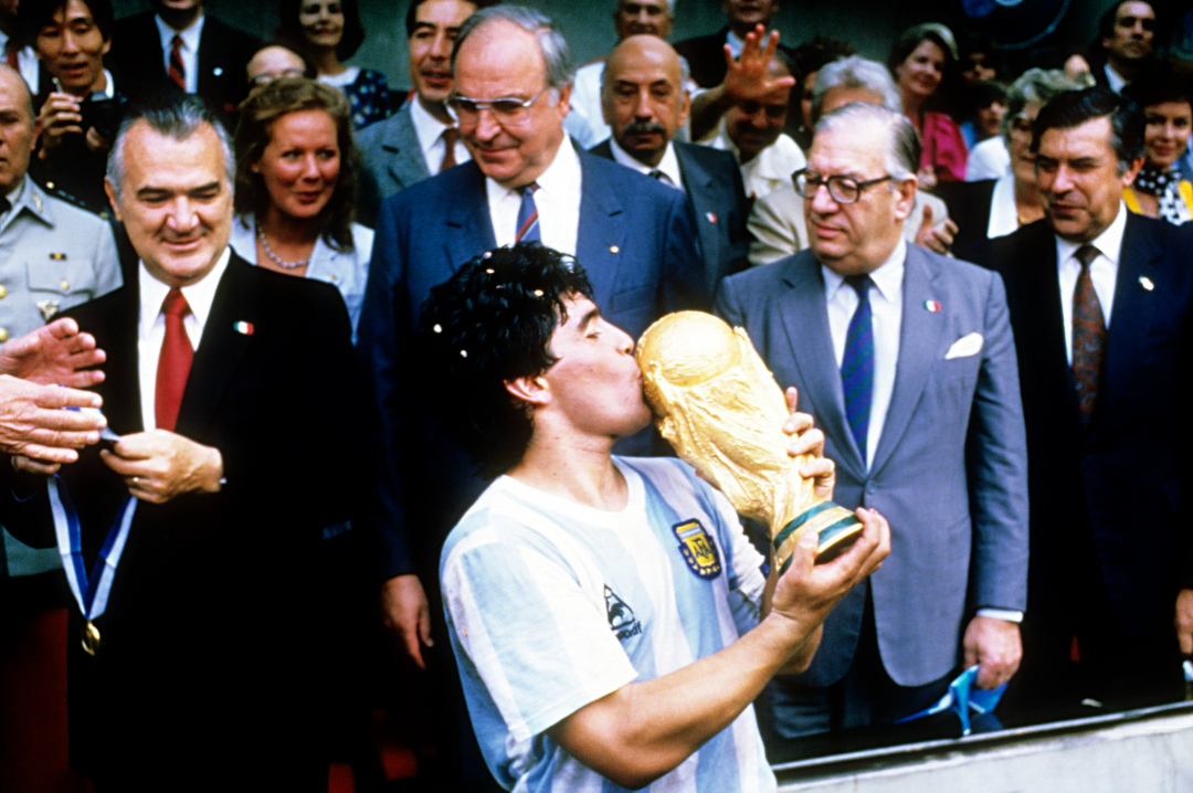 1986年世界杯,阿根廷夺冠,马拉多纳亲吻金杯。图/IC