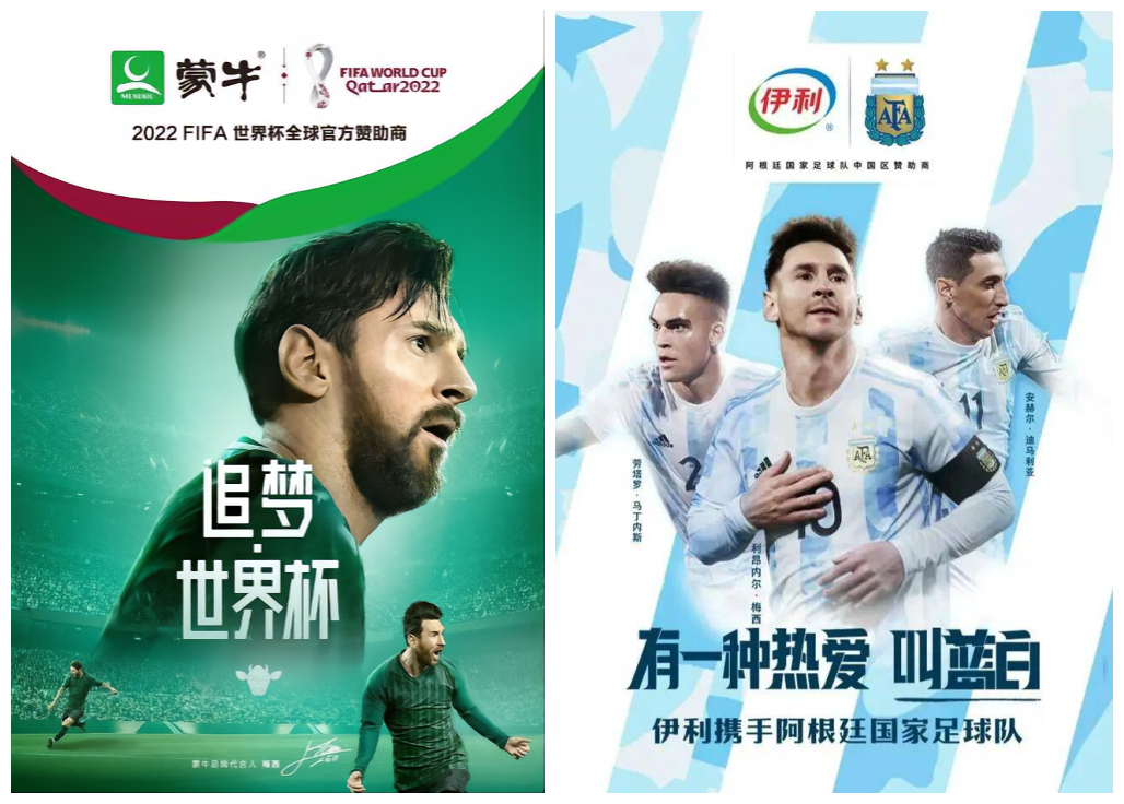 以往大家更关注耐克与阿迪达斯、可口可乐与百事可乐等“老冤家”如何交锋,而在本届卡塔尔世界杯,不少球迷的目光或许被我国两大乳业巨头——蒙牛vs伊利给吸引了。本届世界杯,蒙牛是官方赞助商,并签约梅西和姆巴佩作为官方代言人;似乎是相对应的,伊利签约了C罗、内马尔、甚至刚刚拿下金球奖的本泽马(因伤缺席本届杯赛)。此外,伊利还一举签下阿根廷、葡萄牙、德国和西班牙四支球队,可谓“全副武装”迎战蒙牛。