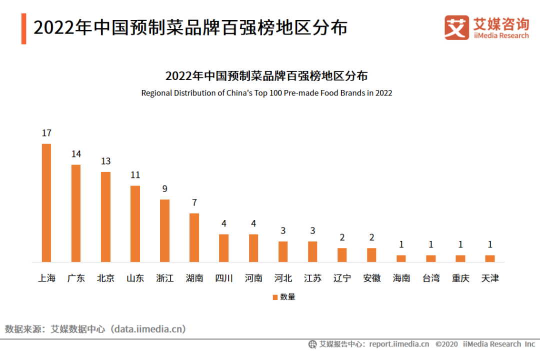 本次上榜的品牌中,有17%来自上海,14%来自广东,13%来自北京。上榜品牌数量较多的地区普遍为沿海地区,这些地区的企业更有经营优势,而他们的优势得益于开明的对外贸易政策和优越的地理交通位置,同时,也能进一步推动国内预制菜出海的步伐。
