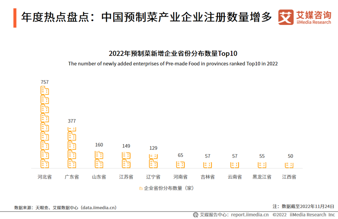 随着预制菜发展政策的颁布,各地企业也相继跟进。数据显示,2022年共2799家预制菜企业注册,其中河北省企业注册量为757家,位列第一,广东省也紧随其后,企业注册量为377家。艾媒咨询分析师认为,在B端市场,疫情期间预制菜需求量激增,各省份预制菜相关企业注册量随之增多,市场发展潜力逐步释放。但参与者的增多,将进一步加剧行业的竞争。