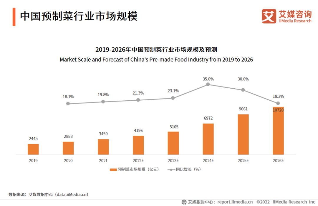 数据显示,2022年中国预制菜市场规模达4196亿元,同比增长21.3%,预计未来中国预制菜市场保持较高的增长速度,2026年预制菜市场规模将达10720亿元。预制菜有效地降低运营成本,吸引各品牌入行布局,已步入发展的黄金时期。