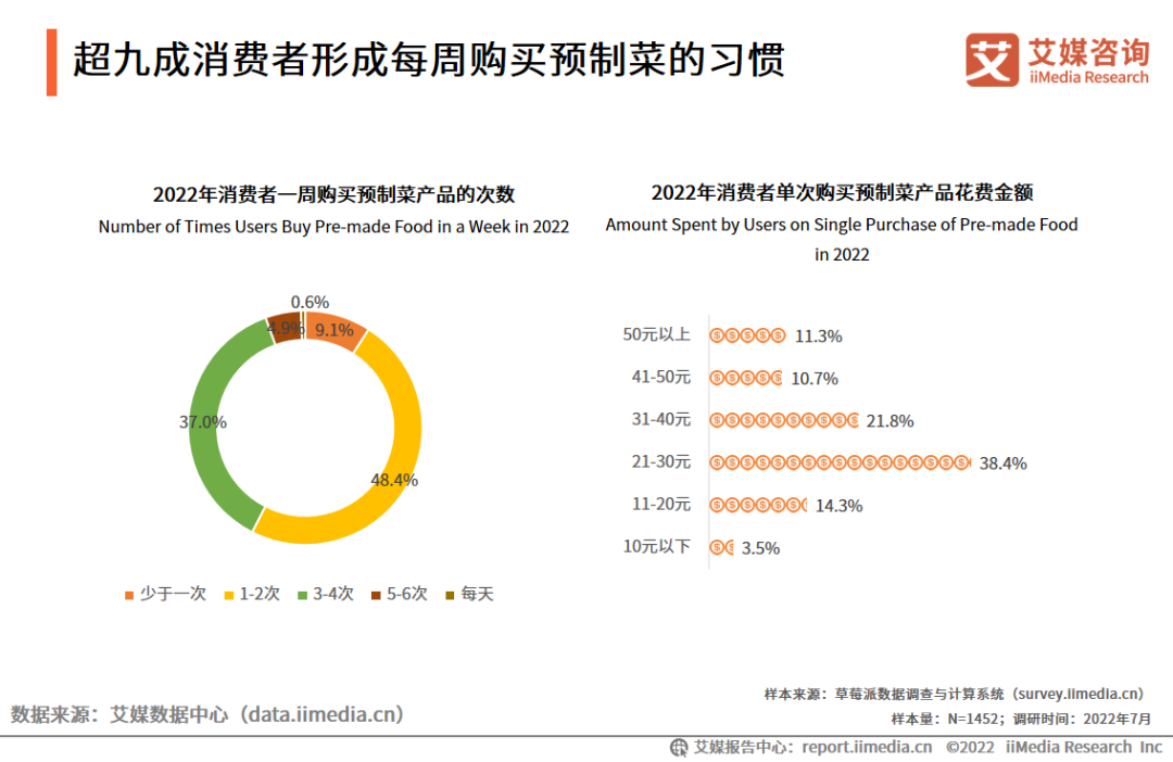 调研数据显示,每周购买预制菜品1-2次的消费者占48.4%,每周都购买预制菜的消费者占比达90.9%。价格方面,消费者单次消费21-30元占比最多,其次是31-40元。艾媒咨询分析师认为,超九成消费者已经形成每周购买预制菜品的习惯,消费者对预制菜需求量大,市场将进一步扩容。