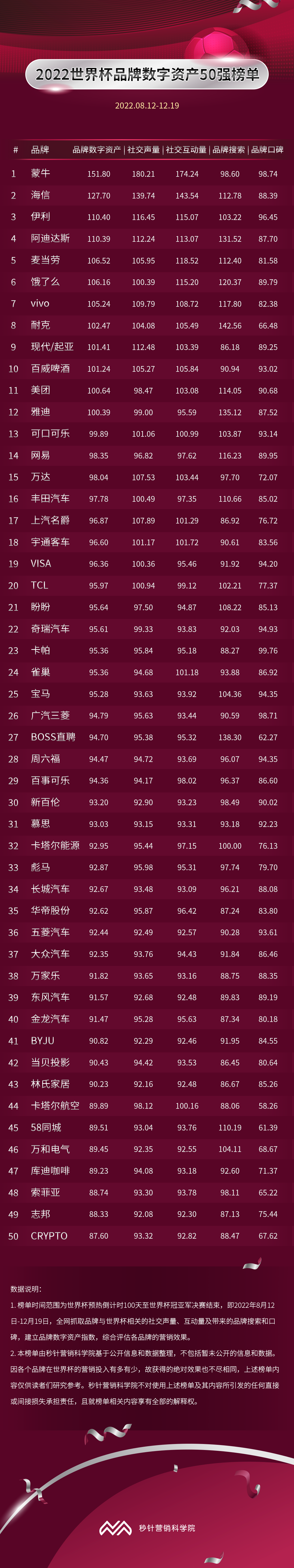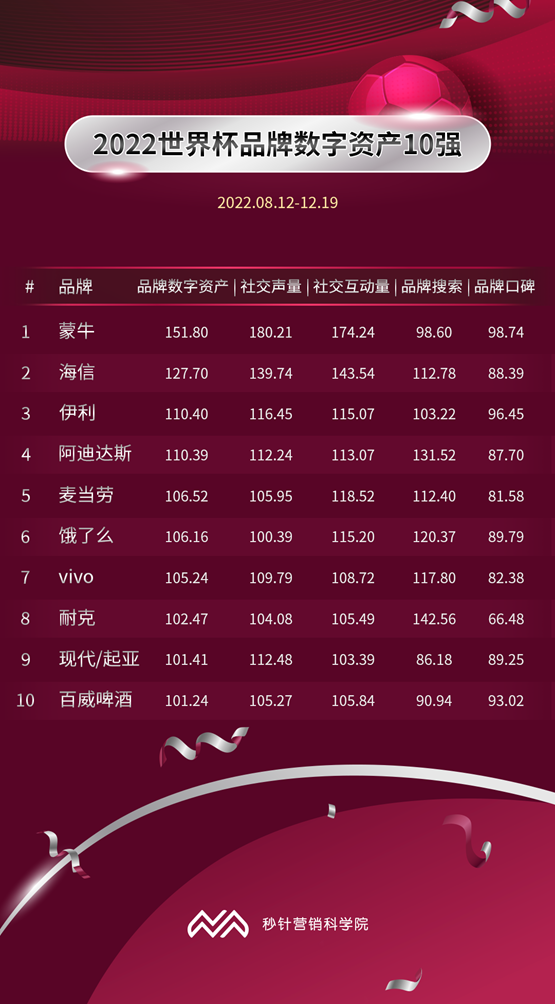 伴随着梅西捧起大力神杯,《2022世界杯品牌数字资产榜(总榜)》,正式出炉。最终,蒙牛以高于第二名20多分的品牌资产总分优势,高居榜首,其中社交声量、社交互动量均遥遥领先其他品牌。《2022世界杯品牌数字资产榜》融合秒针营销科学院多年全域营销数字化经验,旨在基于客观的数据与科学的研究方法,探究各企业世界杯期间的营销效果。总榜榜单以8月12日-12月19日为监测时间范围,计算和分析从本届世界杯预热倒计时100天至决赛周期内,全网抓取品牌与世界杯相关的社交声量、互动量及带来的品牌搜索和口碑,建立品牌数字资产指数,综合评估各品牌的营销效果。品牌数字资产榜通过四个维度:社交声量(品牌进入消费者心智的基础)、社交互动量(消费者对品牌发生初步兴趣)、品牌搜索(通常是购买的前奏)和品牌口碑(复购、推荐的关键)构成。