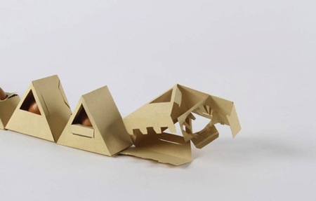 这款六边形鸡蛋包装盒就像一只橘子,骨碌一下子把“橘子皮”摊开,就变成了连着皮却瓣瓣分开的独立三角包装啦。每个三角纸盒里端坐着一只饱满的鸡蛋,很有档次吧。