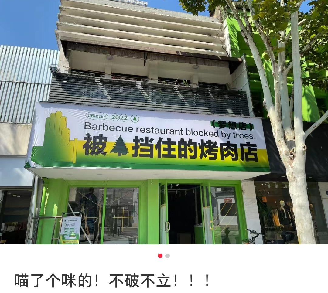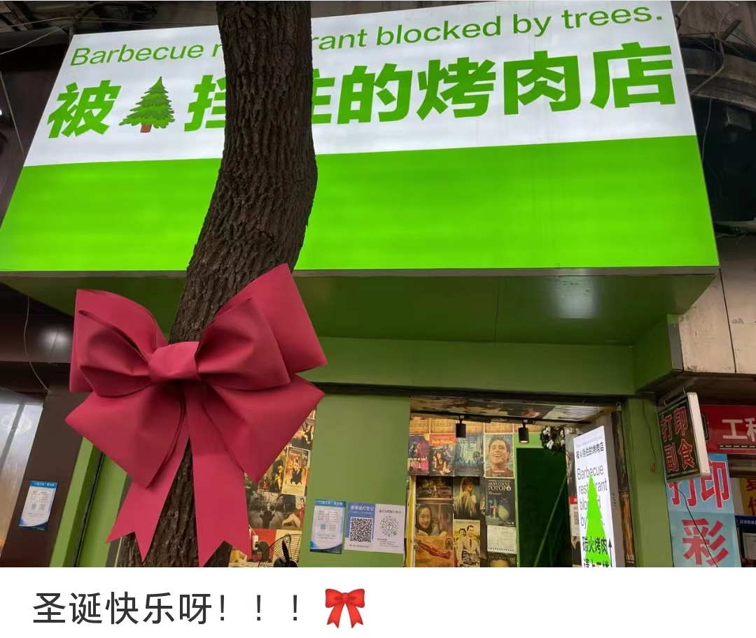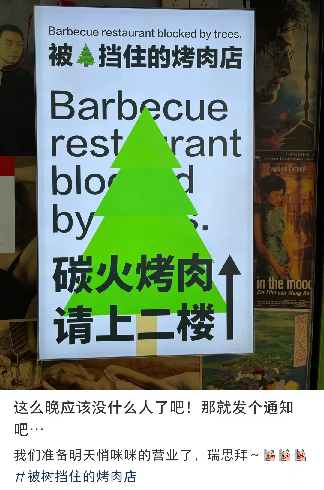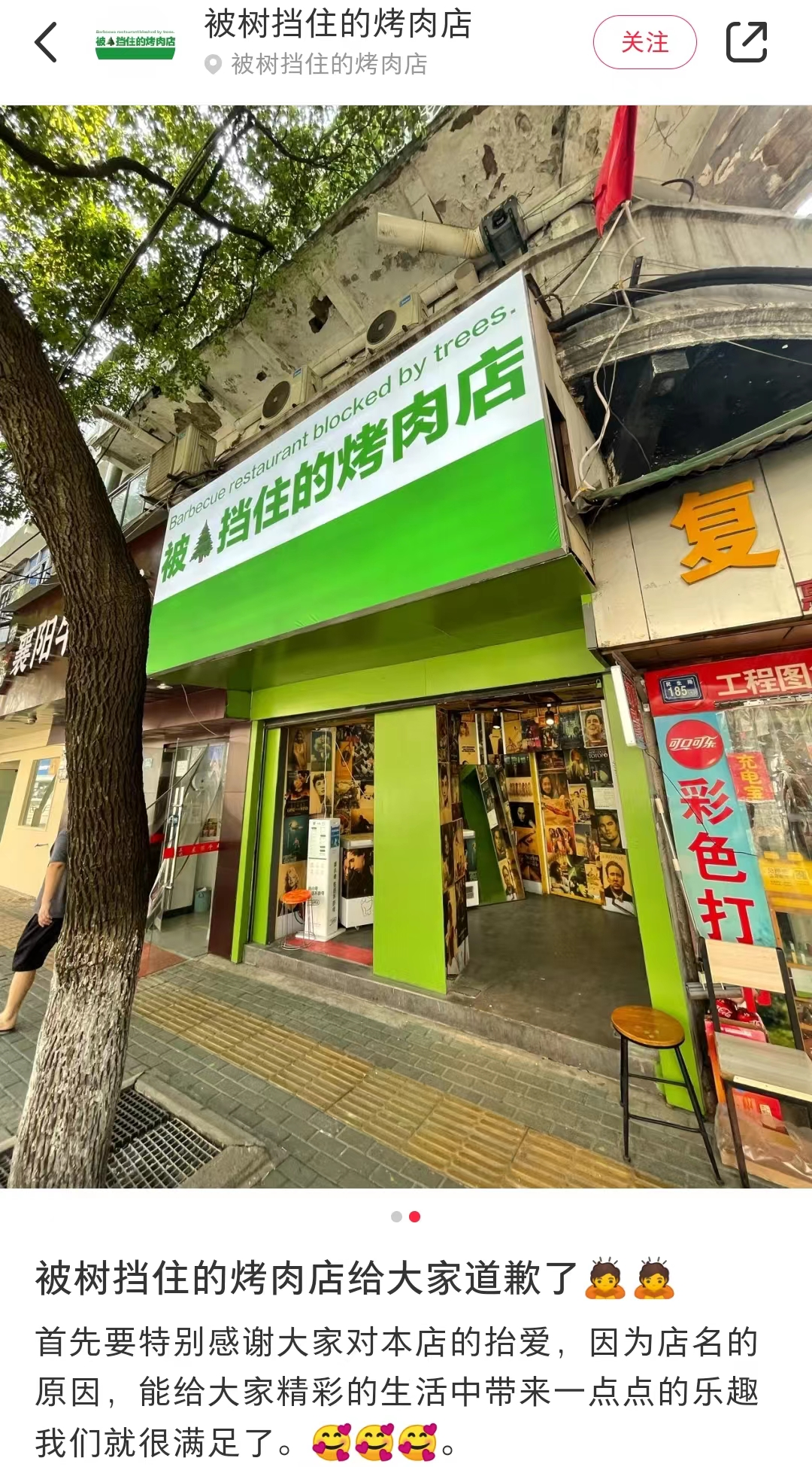 因为店的选址在一棵树的后面,让新来的客人总不太容易找,于是店家就把店的名字改成了“被树挡住的烤肉店”。