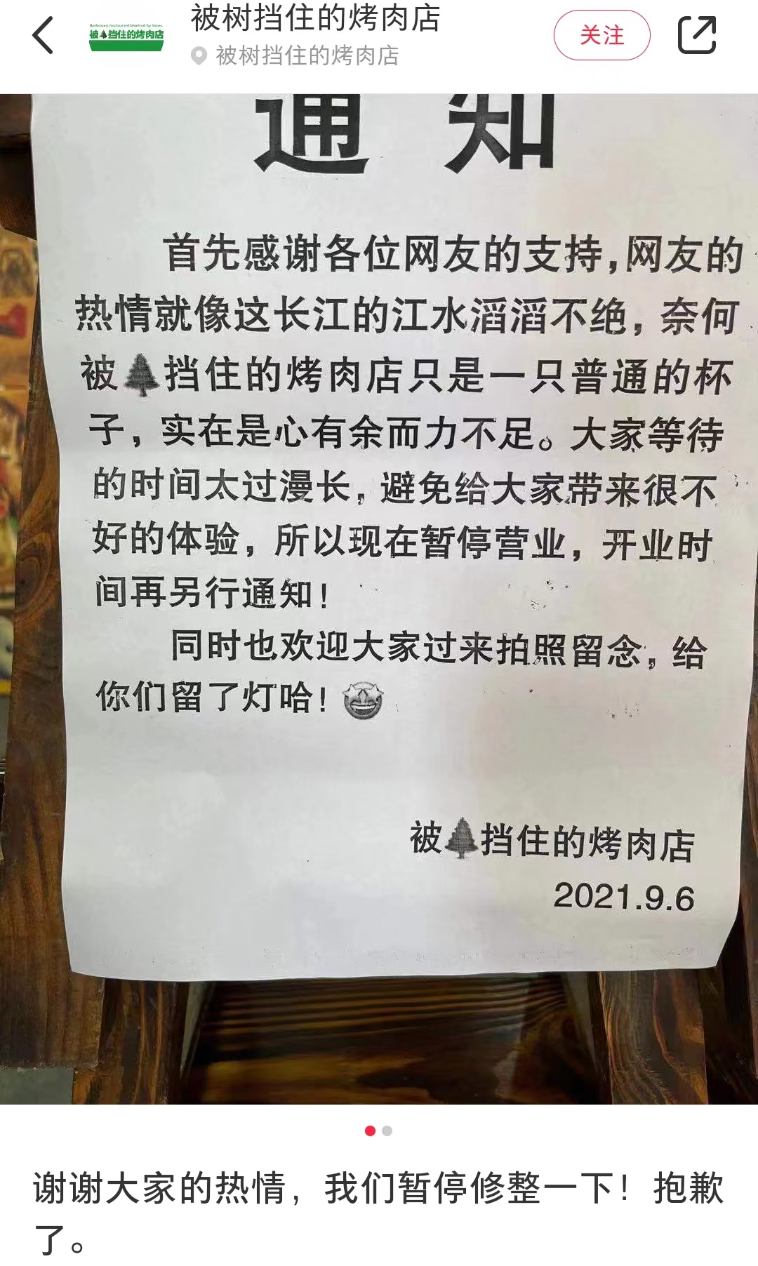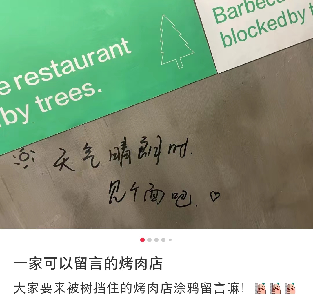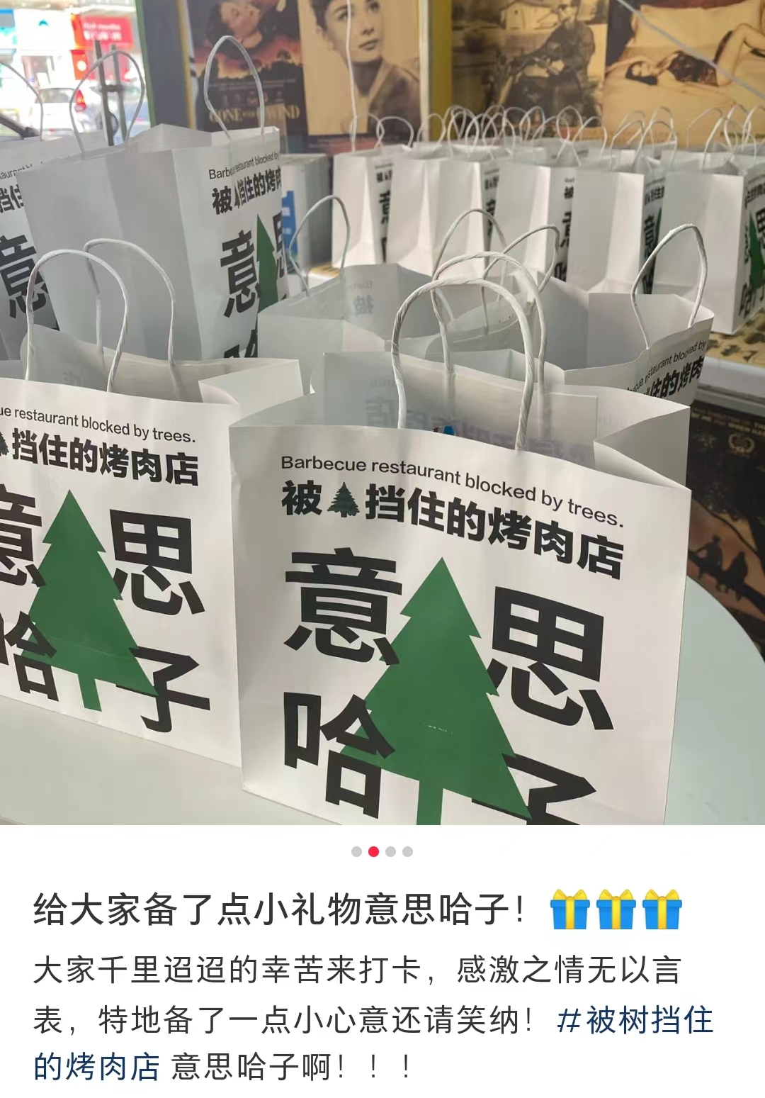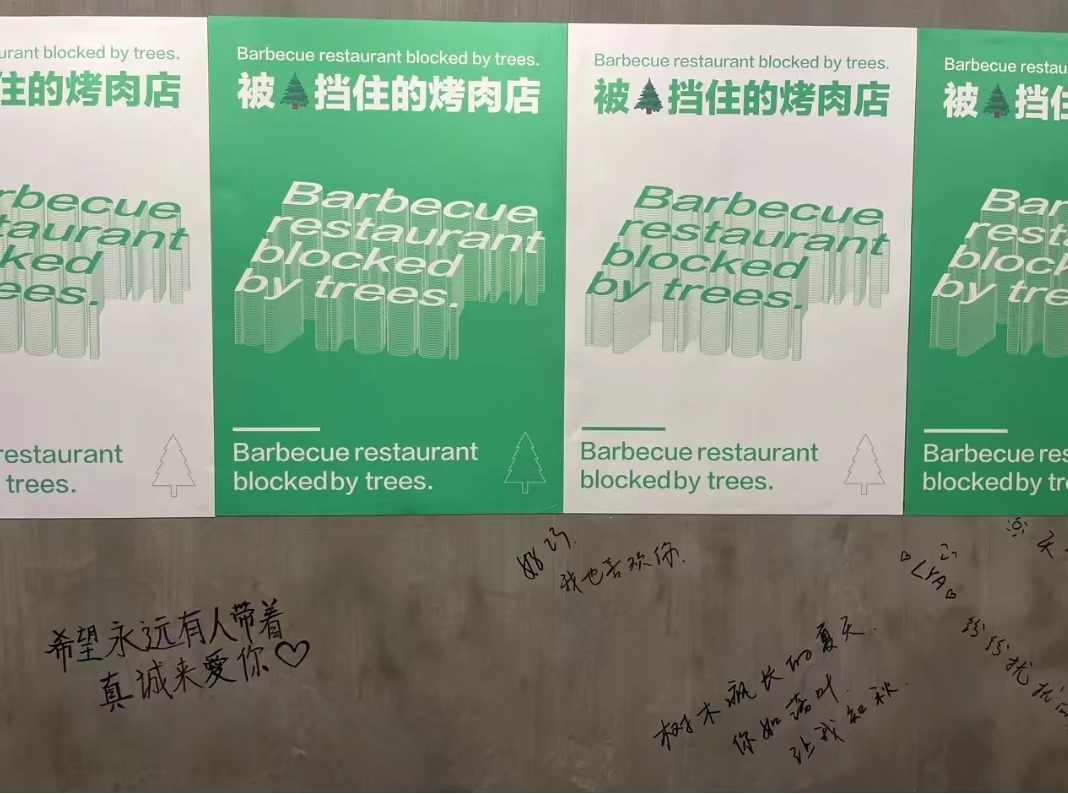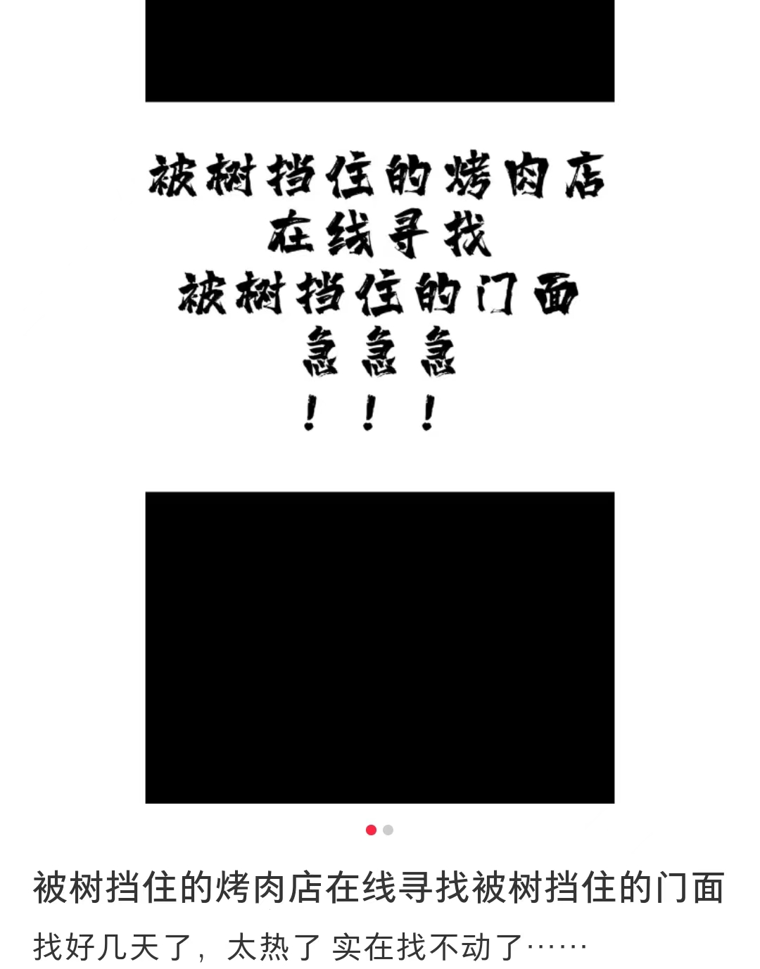 因为店的选址在一棵树的后面,让新来的客人总不太容易找,于是店家就把店的名字改成了“被树挡住的烤肉店”。