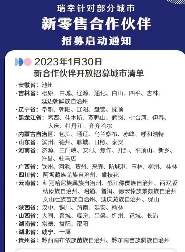 紧接着1月30日,瑞幸发布了新一轮的新零售合作伙伴招募计划,涉及全国15省80个城市。此时距离上一次12月5日合作伙伴的招募,仅过去了不到两个月。当时的招募计划面向安徽、河南、黑龙江、吉林、辽宁、内蒙古、山东、山西、陕西9个省,共对41个城市开放。而相较上一轮,瑞幸的最新招募范围更为“下沉”,县级城市出现频率更高,新增钦州、佳木斯、松原、包头、通辽、攀枝花、普洱、三门峡等33个城市。