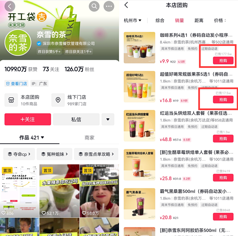 一个很容易被人忽略的事件是,就在此后不久,抖音召开了首届新茶饮大会,会上公布了一组数据:2022年,平台茶饮业务交易金额同比增长了30多倍—记者留意到,在到店业务方面,渠道带来的变化实际上也一定程度,带动了茶饮品牌的咖啡业务。比如,奈雪的茶在去年11月上线一款“9.9元四选一”的咖啡团购券,目前显示已经销售超过177.5万件,甚至远高于其销量排名第二的“16.8元五选一”的果茶团购券,后者显示销量17.5万件。