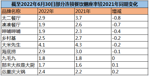 在2022年披露了翻座率数据且以内地业务为主的港股餐饮公司中,翻座率大多不够理想:海底捞由2021年同期的3.0下滑至2.9;呷哺呷哺餐厅受客流影响,翻座率从2021年同期的2.3降至1.9;乡村基2022年翻座率由2021年同期的2.7降至2.5,九毛九旗下太二餐厅的翻座率也由2021年同期的3.7降为2021年同期为2.9。