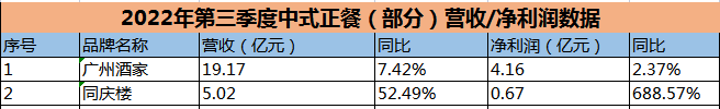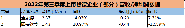 中式正餐品类方面,从净利润来看,疫情下的经营不振让西安饮食、全聚德第三季度持续亏损。二者在2022 年度业绩预告中也纷纷表示,公司多家门店因疫情影响闭店或关闭堂食,加上人工成本、租赁费等固定费用的上升,对净利润造成了较大影响。