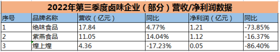 而同样“明星”的卤味品牌绝味食品在其近日发布的2022年度业绩预告中显示,公司2022年实现归属于上市公司股东的净利润为2.2亿-2.6亿元,同比下降73.49%-77.57%。