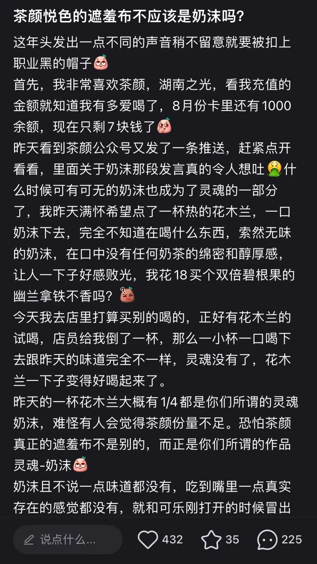 还有让茶颜悦色曾发4000字长文回应的奶沫问题,不少消费者认为奶沫本身会影响口感,而且在热饮中添加还会导致容量不足。