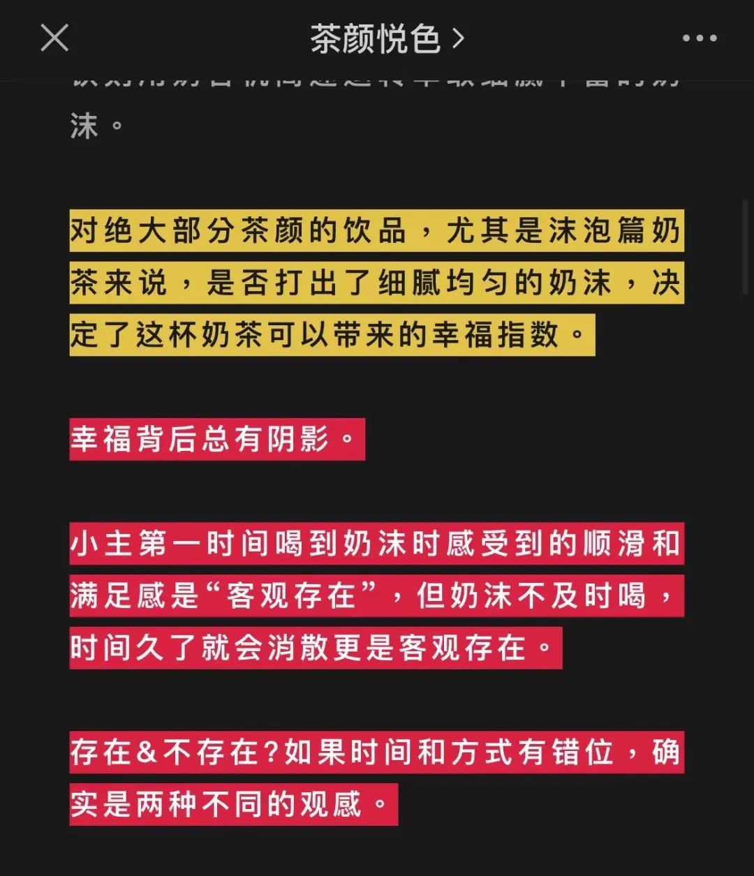 是否打出了细腻均匀的奶沫,决定了这杯奶茶可以带来的幸福指数;小主第一时间喝到奶沫时感受到的顺滑和满足感是“客观存在”,但奶沫不及时喝,时间久了就会消散更是客观存在。存在&不存在?如果时间和方式错位,确实是两种不同的观感。