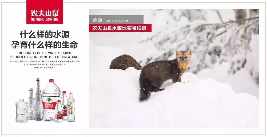 什么样的水源孕育什么样的生命,广告片中的野生动物优美又有力地证明了农夫山泉的纯正水源地,不是竞争对手攻击的那样:都是地表水,不干净。农夫山泉出品的长白山主题的玻璃瓶水,目的并不在于卖出多少利润。而是向消费者传递农夫山泉的高品质,以及长白山的优质水源地。