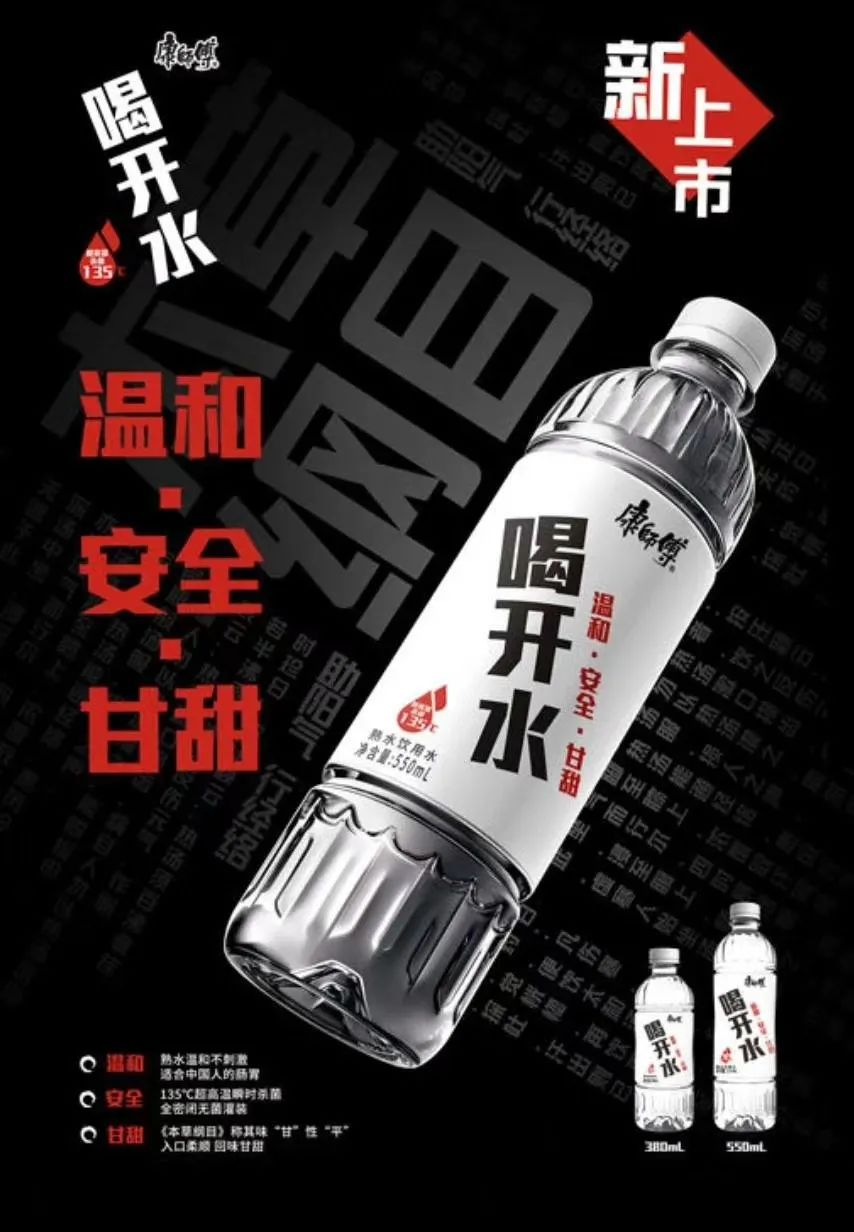 喝开水把自己定义为:熟水饮用水。这妥妥是跟凉白开正面冲突的意思。且不说凉白开的概念本身没有竞争力,几乎全是靠母公司今麦郎的渠道力量轰出来的,康师傅的喝开水和凉白开也没有任何差异化。