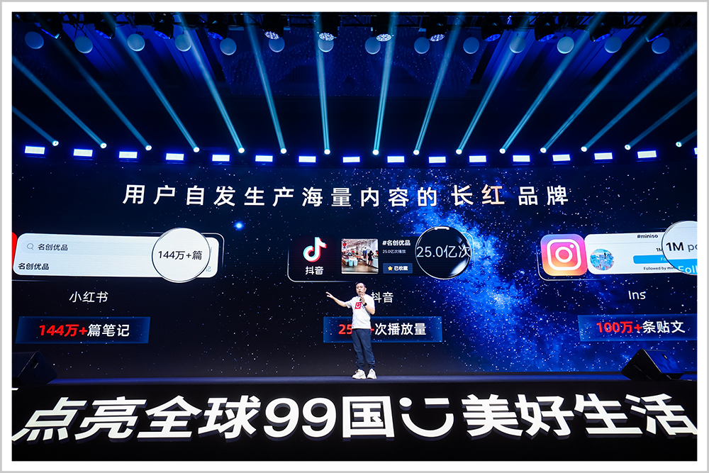 在小红书上,围绕名创优品的笔记超过144万篇,名创优品成为了小红书上讨论最多的中国消费品牌之一;在抖音上,名创优品话题相关的视频有25亿次播放量,在海外媒体INS上有100万条图文。