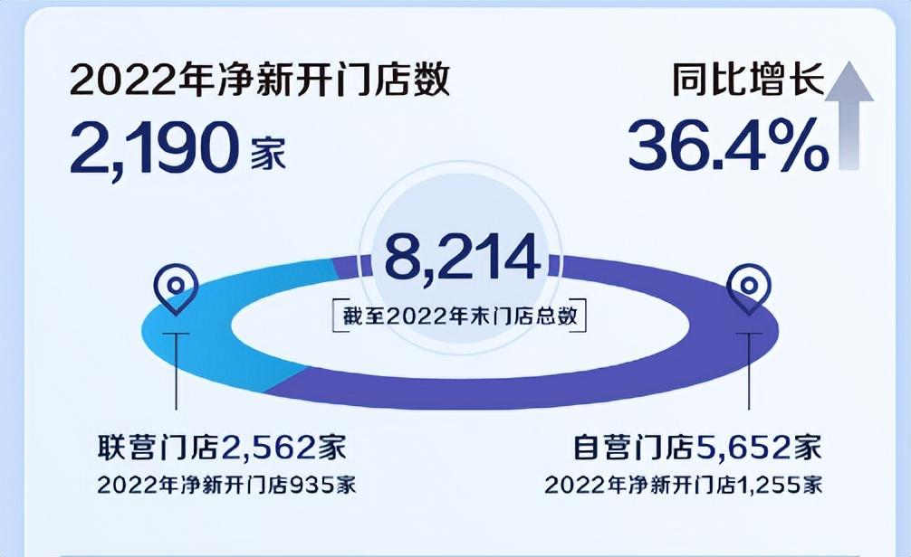 其中,自营门店5652家,依然占主体,在2022年的收入为94.145亿元,较2021年的收入61.927亿元增长52%。
