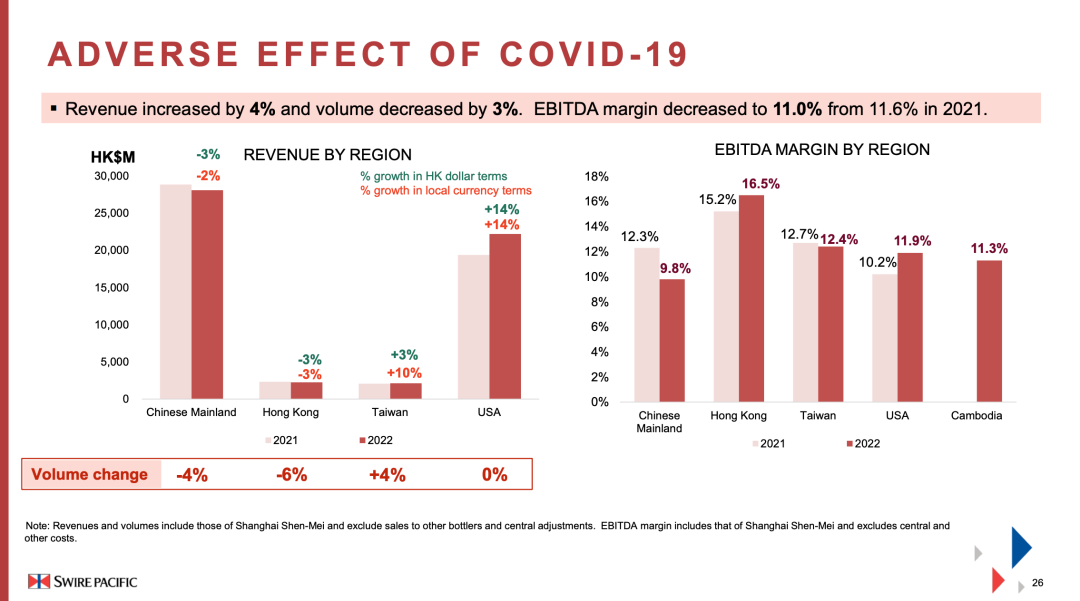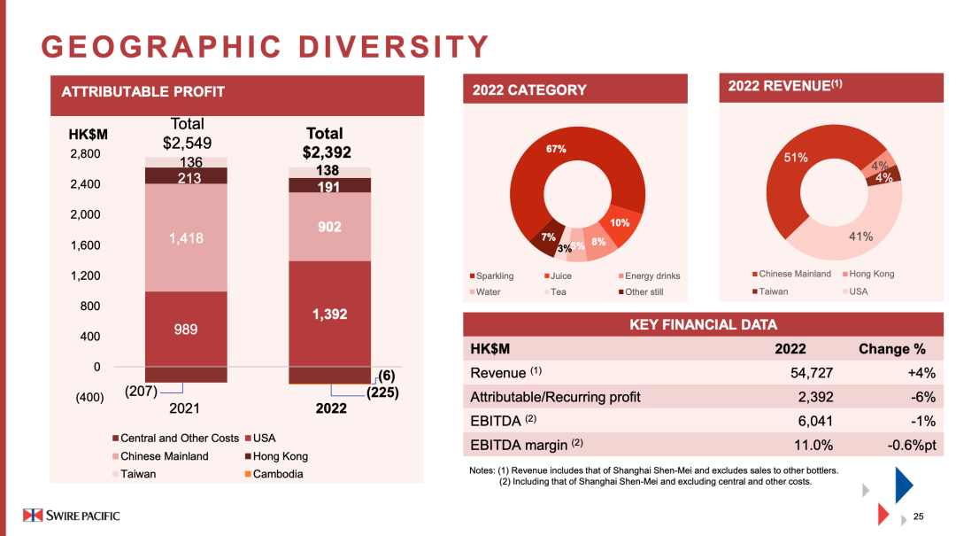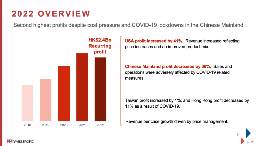 尽管去年由于疫情原因而在中国内地市场表现不佳,但生意覆盖多个地区的太古可口可乐“东方不亮西方亮”。2022年,太古可口可乐录得应占溢利港币23.92亿元,同比减少6%。中国内地、香港和台湾地区的疫情相关措施对业绩造成不利影响,美国的强劲表现将部分影响抵销。