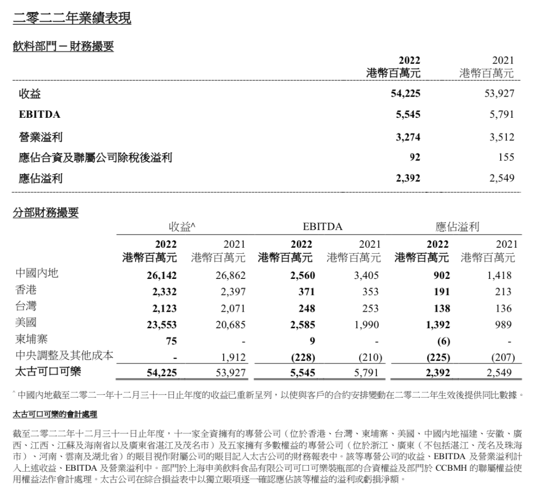 截至2022年年底,太古可口可乐于在大中华区、美国及柬埔寨的专营区域,经销可口可乐公司产品予7.82亿人口。作为可口可乐在华两大装瓶商,太古可口可乐和中粮可口可乐在中国内地市场“两分天下”,前者为大约7亿中国内地消费者提供服务,因此,其财报也是一窥可口可乐在华业务的重要“窗口”。