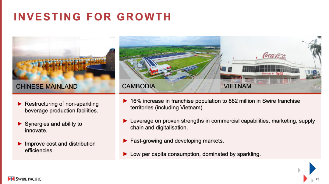 小食代曾介绍,2023年1月和2022年11月,太古可口可乐分别完成收购可口可乐旗下在柬埔寨及越南的装瓶业务,总代价10.15亿美元。这使得太古可口可乐特许经营区域人口增加15%至约8.8亿人。“这是一个高得惊人的数字,因此我们对这两个新市场感到非常兴奋。”白德利今天说。