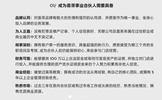 ▲图源:喜茶喜茶希望借助积累多年的实战经验和品牌经验,对事业合伙门店在品牌、产品、营运、培训、供应链等多维度、全方位给予充分赋能。“严格筛选+充分赋能”,亦是喜茶当下对事业合伙门店的基本态度。