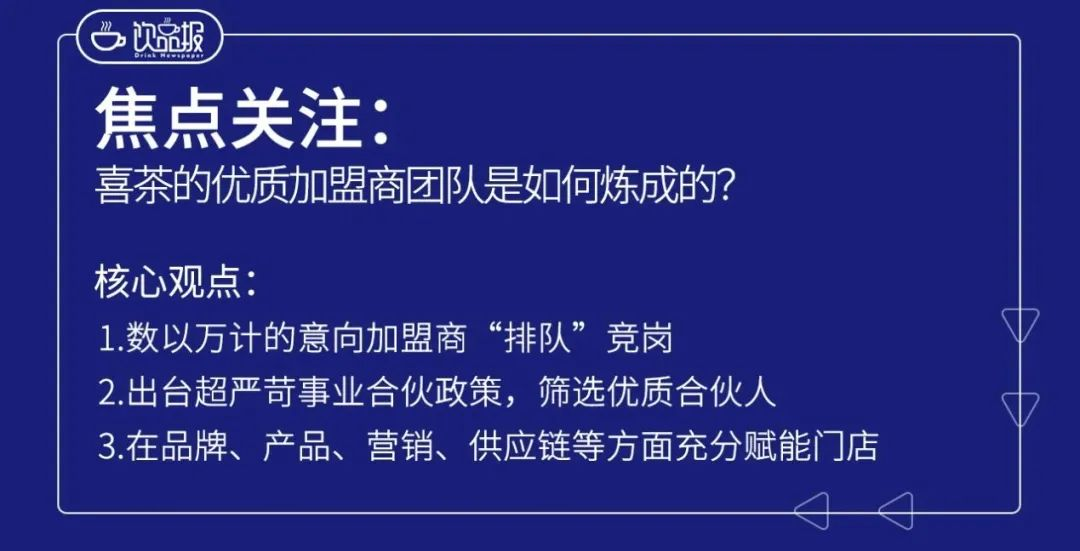 02按照喜茶方面给出的数据,去年,在开放事业合伙申请入口24小时内,喜茶便收到了超过1万份的申请数量。这得益于喜茶在前期积累的超强影响力。作为新茶饮领域的头部品牌,喜茶在前期一直坚持直营路线。曾经很长一段时间里,喜茶都在搜索引擎上用大写标粗的“暂不开放加盟”来对抗山寨喜茶。但随着喜茶的持续成长,创业者对喜茶的关注不降反升。在这种背景下,“千呼万唤始出来”的事业合伙人计划,吸引万人排队。而对于事业合伙人的筛选,喜茶相当谨慎。