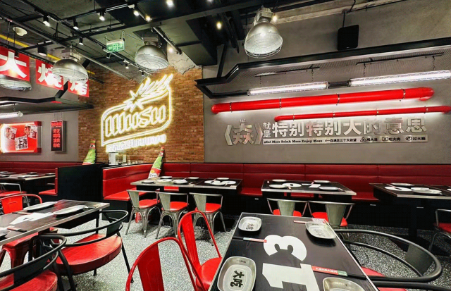 正如其名,乌苏𡘙烤打出了“大酒大肉大烧烤”的slogan,门店也紧紧围绕着“大”做文章,整体被打造成了一个酒仓,“大”的要素随处可见,如「大人有大量冰箱」、售卖周边的「大卖部」、标有“大吃”文案的大号餐具等。