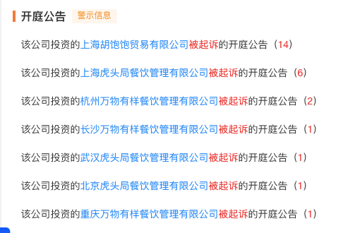 查询天眼查发现,进入2023年,虎头局的开庭公告明显多了起来,包括上海、杭州、长沙、武汉等在内的数个城市的子公司,都有被供应商起诉的记录。