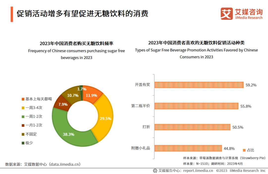 iiMedia Research(艾媒咨询)数据显示,38.3%消费者一周购买1-2次无糖饮料,29.5%消费者一周购买3-4次;在活动促销中,消费者较喜欢开盖有奖、第二瓶半价、打折,分别占比59.2%、55.8%、50.5%。艾媒咨询分析师认为,无糖饮料消费频率较高,促销活动增多将进一步提升消费者购买欲望,拉动消费增长。