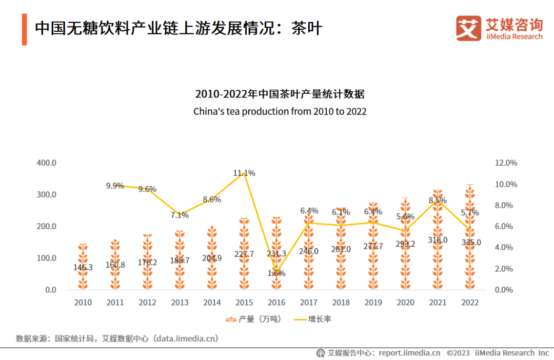 茶叶作为天然的健康饮品,具有广大的消费群体,近年成为中国无糖饮料重要生产原料。数据显示,2022年中国茶叶产量已达到335.0万吨,同比增长5.7%。艾媒咨询分析师认为,“茶文化”在中国源远流长,近年来由于人们对健康饮品的追求,许多和茶叶相关的茶展会、茶叶主题餐厅及酒店等也相继上市。总体而言,需求拉动供应端增长,茶叶生产情况相对稳定,无糖饮料原材料供给得到保障。