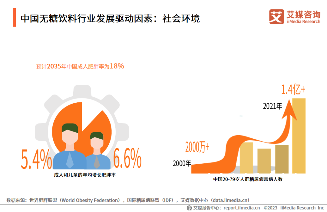 据2023年3月世界肥胖联盟公布的《世界肥胖地图》显示,预计2035年,全球将有超过40亿人超重/肥胖,占全球总人口的一半以上。肥胖可导致机体内分泌和代谢异常,常常伴随着多种疾病。糖尿病作为一个全球公共卫生问题,在中国尤为棘手。随着物质生活水平的提高,糖尿病渐成我国一种常发性的疾病,中国20-79岁人群糖尿病患病人数从2000年的2000多万人增至2021年的1.4亿多人。日趋丰富的无糖饮料的上市为相关群体带来福音,满足其对健康、口味的不同需求。
