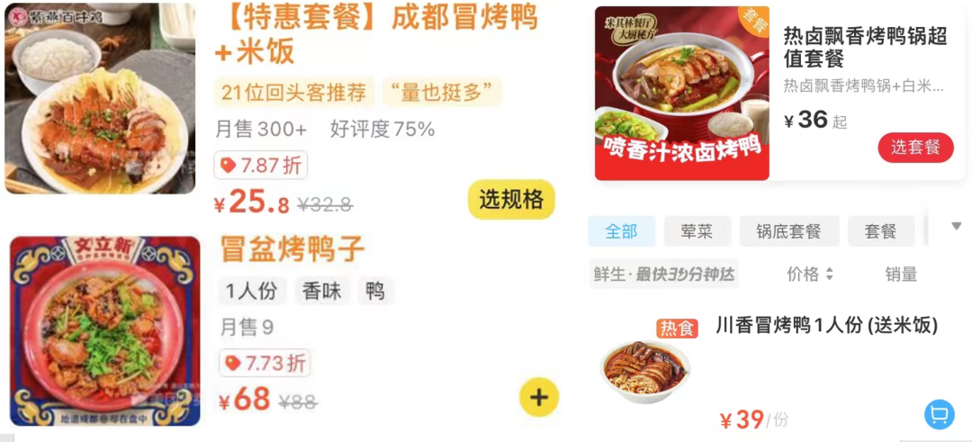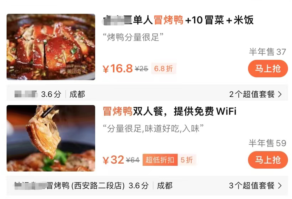 其次,冒烤鸭现在并无头部品牌,是品类>品牌,一家门店火了之后,群起效仿,包括麻辣烫、火锅店甚至快餐店加入单品,接下来就是价格战。大众点评成都已经有一些门店单人餐折后低至17.9,双人餐低至32元。