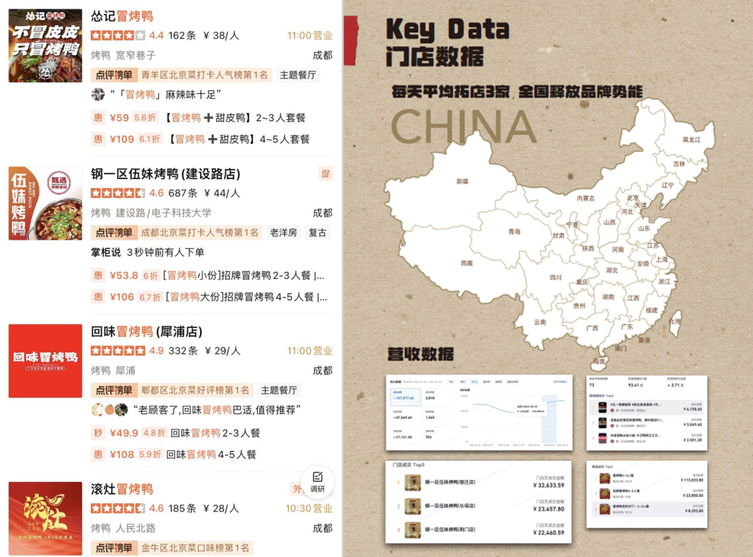 其次,烤鸭、麻辣烫和冒菜在全国市场的认知已经很成熟,而随着疫情解封、旅游的复苏,冒烤鸭的影响力得以短时间内扩散。在势能方面也具有了优势,能从区域产品走向全国。